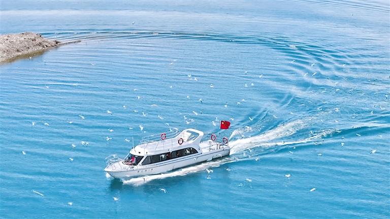 圖為班公湖游船行至鳥島,成群的斑頭雁和棕頭鷗翩然掠過。記者 洛桑旦增 達(dá)珍 通訊員 格桑赤列 攝