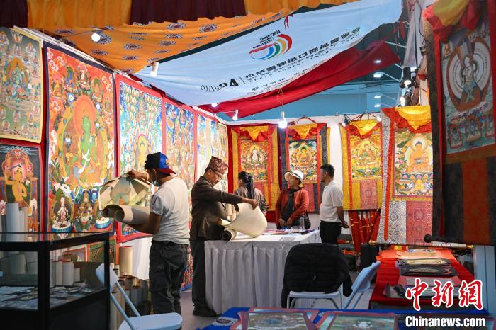 圖為拉薩進(jìn)口商品展覽會(huì)現(xiàn)場(chǎng),顧客在選購(gòu)唐卡。中新社記者 貢嘎來(lái)松 攝