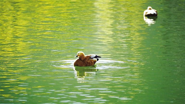 沿著蜿蜒的棧道,向濕地深處走去,清澈的湖水倒映著藍(lán)天、白云,仿佛置身于夢(mèng)幻般的境界。天空中不時(shí)有鳥兒飛過(guò),水中的赤麻鴨自由自在地游來(lái)游去,赤麻鴨寶寶排成“一”字隊(duì)形,緊隨媽媽身后。這里不僅是鳥類棲息的天堂,也是攝影愛(ài)好者最佳的觀鳥地。