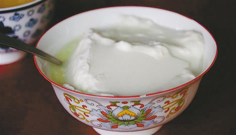 除了常規(guī)的高蛋白大餐,西藏還有許多特色美食,酸奶拌飯便是夏日爽口美食之一。酸奶帶著牦牛奶獨(dú)特的鮮味,提煉后形如“豆腐腦”,白嫩滑溜,口感微酸與微甜交織,令人身心愉悅。在藏族世代延續(xù)的飲食文化中,酸奶拌飯因其豐富的營(yíng)養(yǎng)價(jià)值,深受人們喜愛。