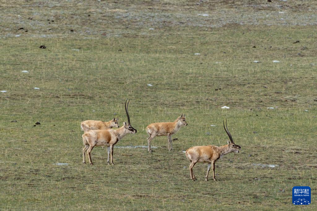 在羌塘國家級自然保護區(qū)核心區(qū)拍攝到的雄性和亞成體雌性藏羚羊(6月9日攝)。新華社記者 旦增尼瑪曲珠 攝 ??