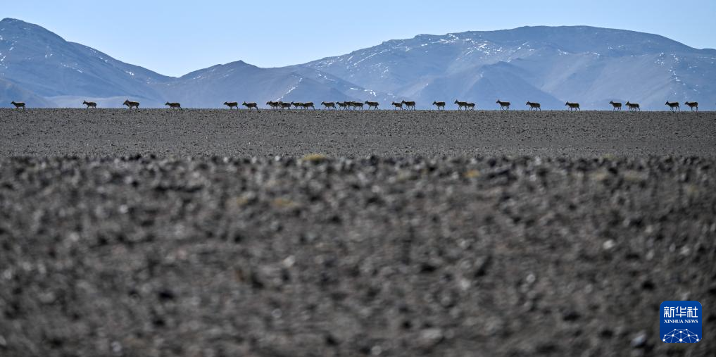 羌塘國家級自然保護區(qū)核心區(qū)繁殖遷徙路上的雌性藏羚羊群(6月10日攝)。新華社記者 姜帆 攝 ??