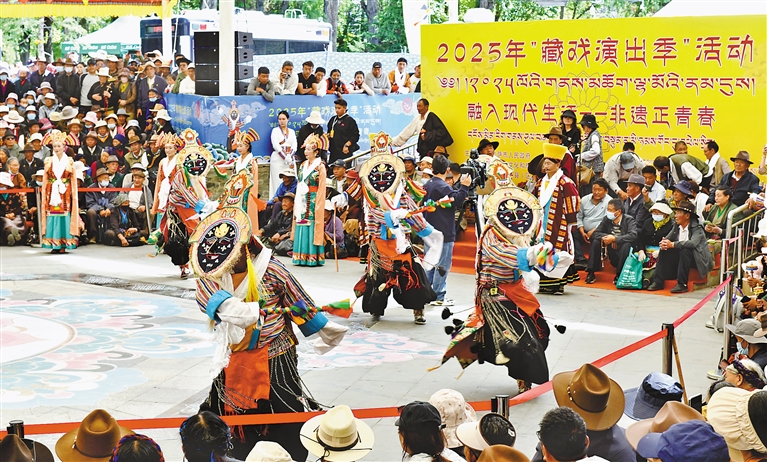 6月13日,以“融入現(xiàn)代生活——非遺正青春”為主題的2025年“藏戲演出季”活動(dòng)在拉薩市宗角祿康公園舉行。本次活動(dòng)由非遺體驗(yàn)、產(chǎn)品展銷、藏戲展演三個(gè)部分組成,精彩的表演吸引了眾多市民游客觀看。圖為活動(dòng)現(xiàn)場(chǎng),拉薩市堆龍德慶區(qū)措麥藏戲隊(duì)帶來(lái)的藏戲劇目《智美更登》。記者 旦增蘭澤 攝