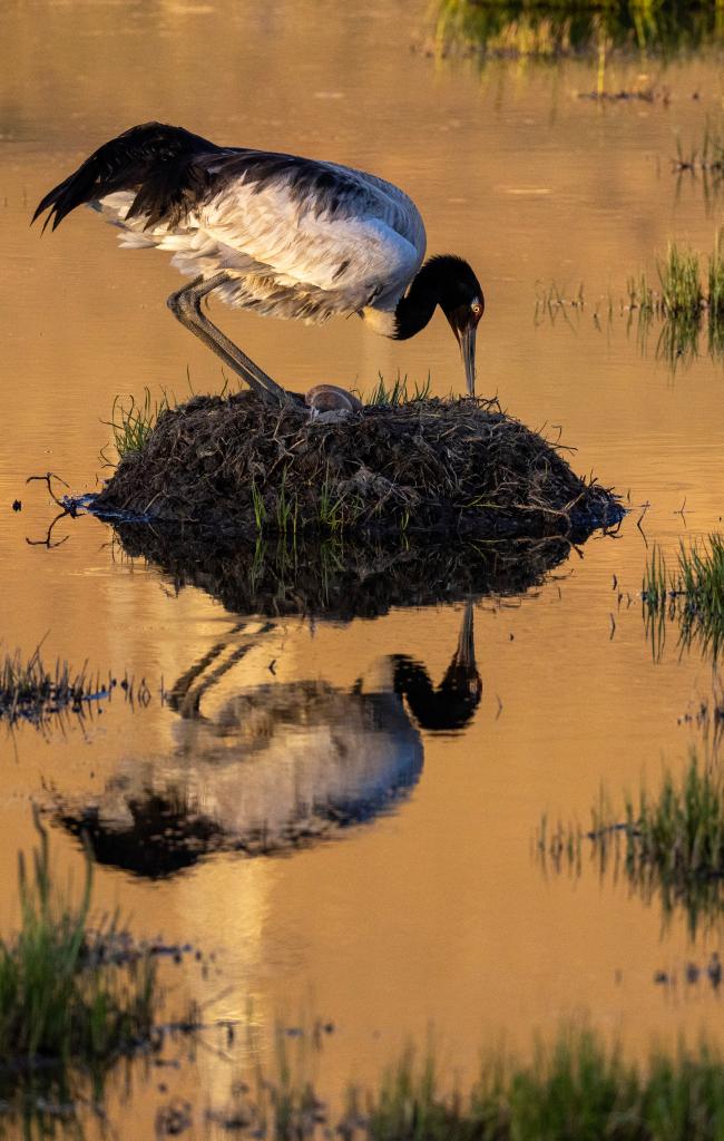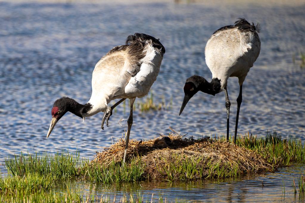 資料記載,黑頸鶴壽命大約為10到15年,通常一生中只有一個(gè)配偶;繁殖期在每年的5月至7月,求偶時(shí)伴隨著舞動(dòng)與共鳴——雙雙把頭伸向前方,彼此呼應(yīng)并發(fā)出“咯咯咯”的響聲,這一行為相當(dāng)于每年一次的“求婚”儀式。黑頸鶴營(yíng)巢于水環(huán)繞的草墩上或茂密的蘆葦叢中,一窩卵通常有2枚。