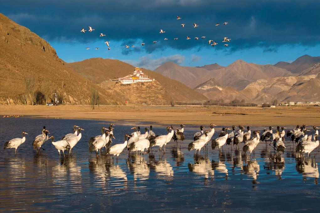 遷徙路線中,東線距離最長(zhǎng),由若爾蓋松潘草地沿岷江流域、邛崍山脈,從北往南到達(dá)烏蒙山區(qū)的湖泊水庫(kù)越冬,直線距離約為800公里;中線則從青海隆寶灘到云南納帕海之間,直線距離雖不及東線但也有800公里左右;西線是一條翻越世界屋脊的越境路線,從新疆東南部、青海西部和西藏北部、西北部的高原,向南或東南遷徙,一部分飛抵雅魯藏布江中游及其支流河谷的低海拔區(qū)域,其余部分則要翻越喜馬拉雅山脈飛達(dá)不丹境內(nèi)越冬。盡管這條線直線距離最短,但它們飛越的高度卻是全世界其他鶴類無(wú)法企及的。