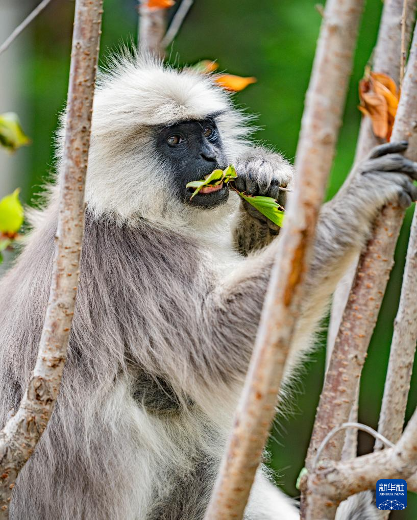 6月20日,在日喀則市亞?wèn)|縣,一只長(zhǎng)尾葉猴在吃樹葉。新華社記者 丁增尼達(dá) 攝 ??