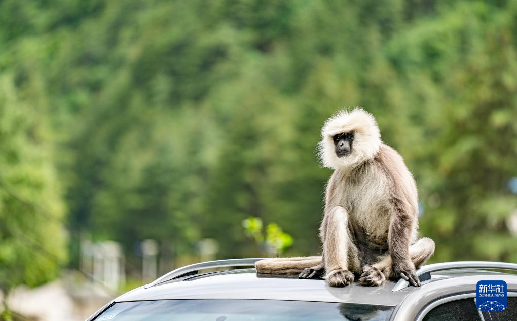 6月20日,在亞?wèn)|縣一條公路邊,一只長(zhǎng)尾葉猴蹲坐在車頂休息觀望。新華社記者 丁增尼達(dá) 攝