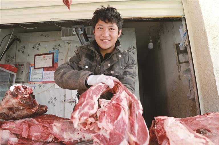“我家有30多頭牦牛,今天拉來兩頭牦牛的肉來售賣,價(jià)錢也很理想,每年冬天我們都會(huì)賣一兩個(gè)牦牛的肉來提高家庭收入?!闭跀偽磺懊β档哪撩駨?qiáng)巴頓珠一邊麻利地切割牛肉,一邊笑著說道。他的皮卡車就停在攤位旁,車廂里放著牛肉,前來選購的消費(fèi)者絡(luò)繹不絕。