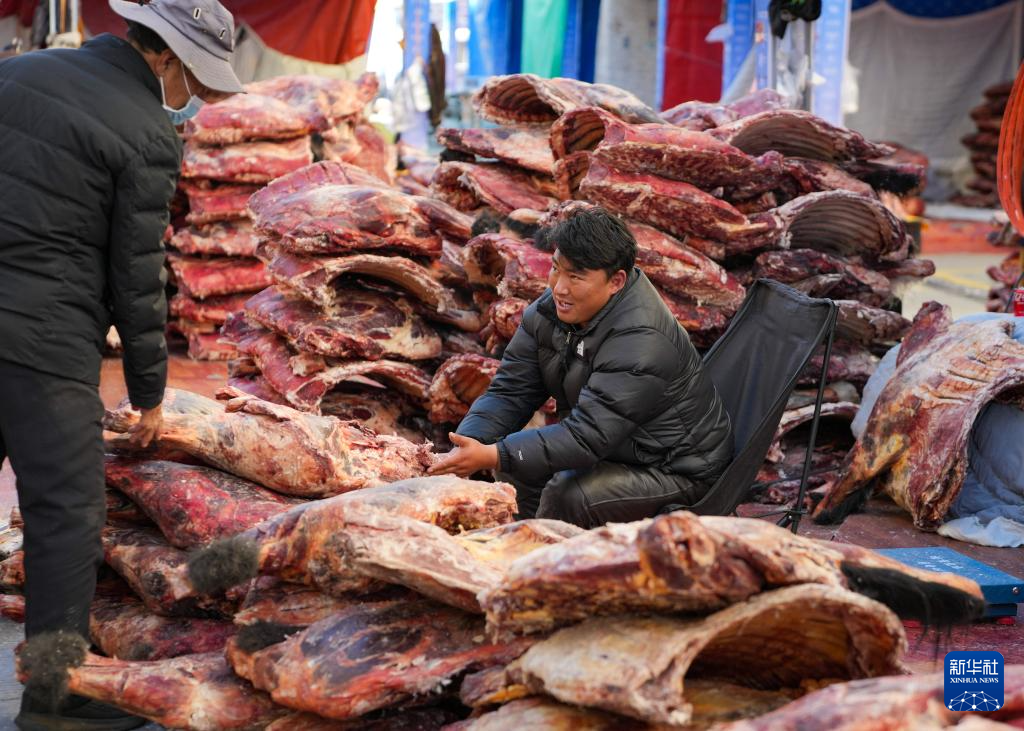 1月8日,在拉薩市納金綜合批發(fā)商貿(mào)城農(nóng)貿(mào)市場,商戶在銷售牦牛肉。新華社記者 晉美多吉 攝