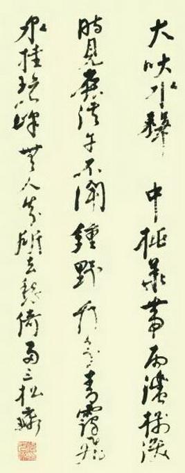倪元璐書法流利秀雅,兼有澀勁樸茂的風(fēng)貌,風(fēng)骨凌厲,異態(tài)高古,格調(diào)曠達(dá)。用筆深得顏魯公厚實(shí)勁健之筆意,更為勁峭,結(jié)體趨于扁方,呈欹側(cè)之勢,以險(xiǎn)寓正,風(fēng)格奇倔剛毅,自成一格。此行書豎幅《李白< ="" ="" ="" ="">》,絹本,縱103.7cm,橫60.3cm,現(xiàn)藏上海博物館。
