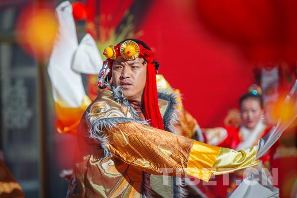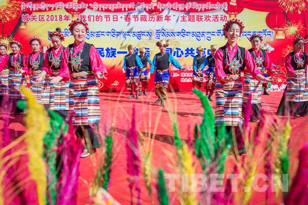 中國西藏網(wǎng)訊 2月8日上午,拉薩市城關(guān)區(qū)藏?zé)嵘鐓^(qū)張燈結(jié)彩,彩旗飄揚(yáng),2018年“我們的節(jié)日o春節(jié)藏歷新年”主題聯(lián)歡活動拉開帷幕,來自城關(guān)區(qū)的雪巴拉姆民間藝術(shù)團(tuán)、娘熱拉姆民間藝術(shù)團(tuán)、阿壩林老年文藝隊(duì)的演員們?yōu)楦髯迦罕妿砹艘粓鲆暵犑⒀纭?/p>