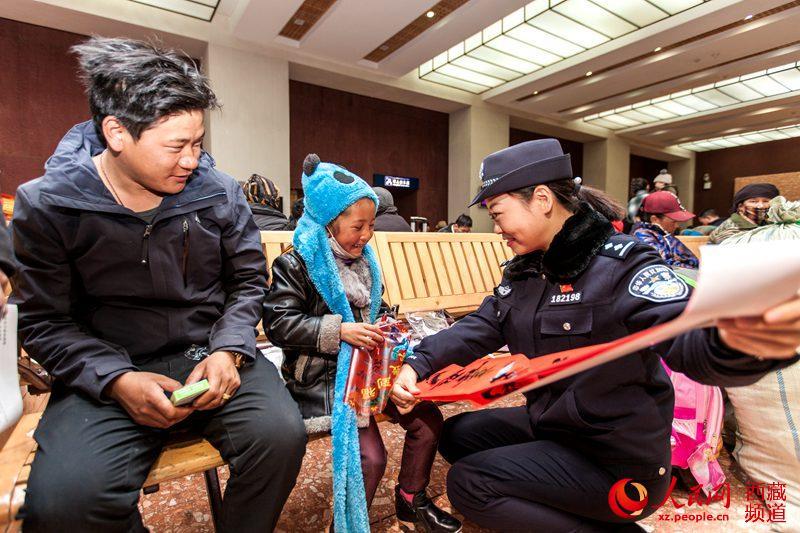 按照“平安出行、有序出行、溫馨出行”工作目標(biāo),拉薩鐵路公安處組織全處各單位干部民警共計(jì)60余人分別在西藏各火車站,緊緊圍繞“服務(wù)旅客為宗旨,待旅客如親人”的理念,開(kāi)展了春運(yùn)首日暨“一路溫馨一路情 天路鐵警伴您行”主題系列活動(dòng)。圖為拉薩鐵路公安處民警(右一)向“小旅客”發(fā)放春聯(lián)。圖片來(lái)源:人民網(wǎng)