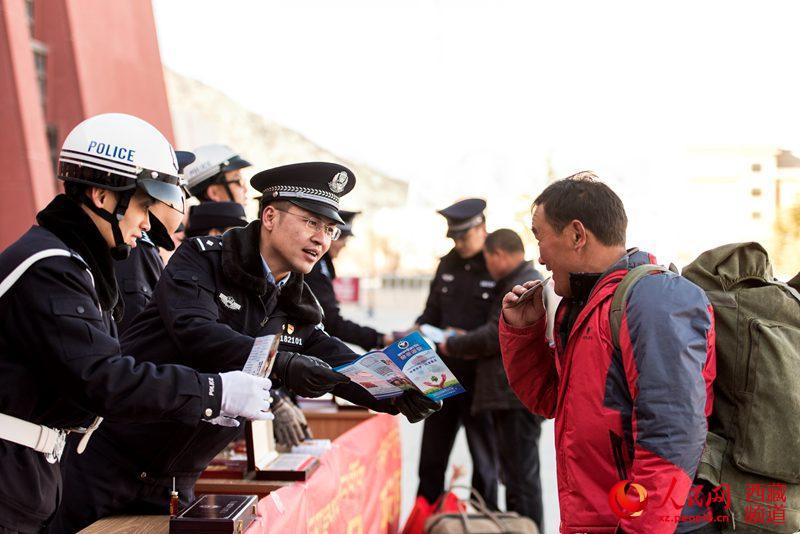 春運(yùn)首日,拉薩鐵路公安處干警為旅客群眾做好事達(dá)800余件,為旅客解答問(wèn)題3000余次,發(fā)放春運(yùn)各類宣傳資料3000余份,全力打造“平安、有序、溫馨”的春運(yùn)環(huán)境。圖為拉薩鐵路公安處民警為旅客講解禁毒常識(shí)。圖片來(lái)源:人民網(wǎng)