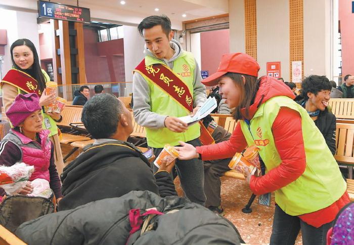 拉薩火車站團(tuán)委聯(lián)合中國(guó)移動(dòng)西藏公司開(kāi)展“黨團(tuán)志愿者愛(ài)心送溫暖 服務(wù)春運(yùn)返鄉(xiāng)農(nóng)民工”主題活動(dòng),一個(gè)個(gè)黨團(tuán)員志愿者的身影在候車室里忙碌著。圖為2月1日,中國(guó)移動(dòng)西藏公司的志愿者正在拉薩火車站候車室給旅客發(fā)放奶茶、礦泉水。 圖片來(lái)源:西藏日?qǐng)?bào) 李洲 攝