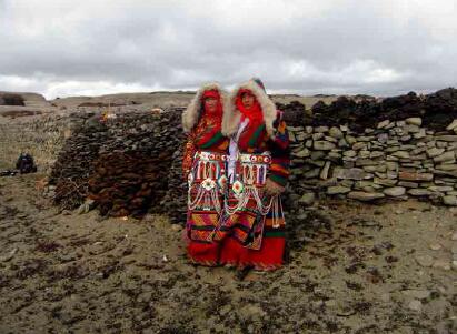瑪旁布姆卡是西女國(guó)女王居住的城堡,普蘭縣文化局局長(zhǎng)加措根據(jù)藏文大字典和《阿里史地探秘》的“瑪旁布莫卡”,解釋出“布”的漢文詞義,就是女人、女性、女子或者女王。“莫”就是香草或者香草遍布此山。據(jù)當(dāng)?shù)匕傩战榻B,城堡遺址坐落在普蘭神湖瑪旁雍措湖的東部扎藏布溫泉溝南側(cè)的野嶺上,海拔5000米上下。在遺址上部高處還有一個(gè)碩大蘑菇形狀的巖石巋然迎風(fēng)屹立城堡上方,與下方城堡遺址交相輝映。這即是“出俞石、朱砂、麝香、牦牛、駿馬、蜀馬,尤多鹽,恒將鹽向天竺興販,其利數(shù)倍”西女王國(guó)的王城。在城堡上方更高處的山后,遺留有眾多的洞穴,說明女國(guó)的百姓就居住在女王的周圍。此外在山坡的下方扎藏布溝處,當(dāng)?shù)匕傩辗Q這塊地方為“卡爾青”,意思是大城堡之地。盡管史書上的記載十分有限,瑪旁布姆卡的故事仍然世世代代流傳在當(dāng)?shù)匕傩盏男闹??;魻柎逡晃荒赀~的老百姓告訴筆者,溫泉溝和曲古寺廟附近就有許許多多女王的傳說,聽說女王曾經(jīng)在此沐浴,但不知具體在什么地方。