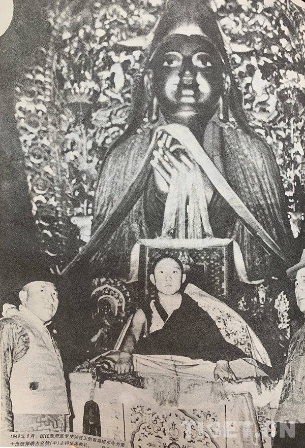 1949年8月,國(guó)民政府派專使關(guān)吉玉到青海塔爾寺為十世班禪額爾德尼o確吉堅(jiān)贊(中)主持坐床典禮。(圖片翻拍自《金鑰匙o(hù)十七條協(xié)議》 陳宗烈提供)