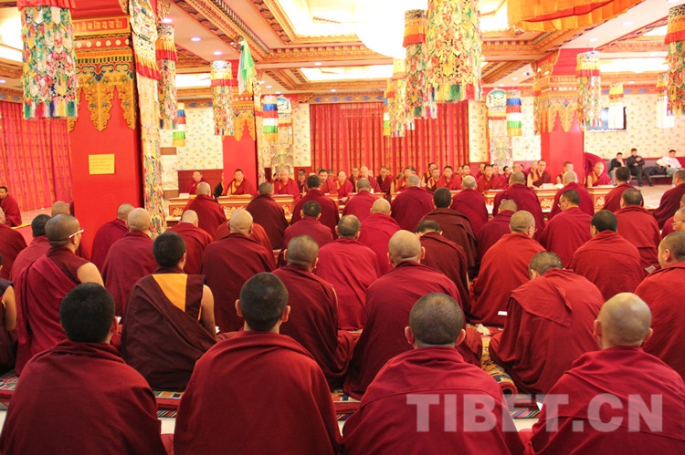 法會禮請全國政協(xié)常委、中國佛教協(xié)會副會長班禪額爾德尼o確吉杰布拈香主法,中國藏語系高級佛學(xué)院領(lǐng)導(dǎo)、經(jīng)師、學(xué)員及宗教界教職員工約130人參加法會。
