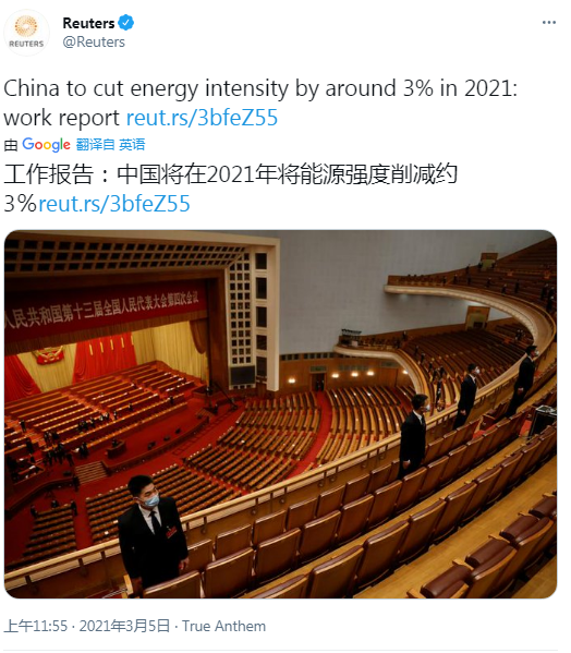 圖為兩會(huì)上的環(huán)保話(huà)題備受外媒矚目。路透社在推文中寫(xiě)道,中國(guó)2021年發(fā)展主要預(yù)期目標(biāo):?jiǎn)挝粐?guó)內(nèi)生產(chǎn)總值能耗降低3%左右