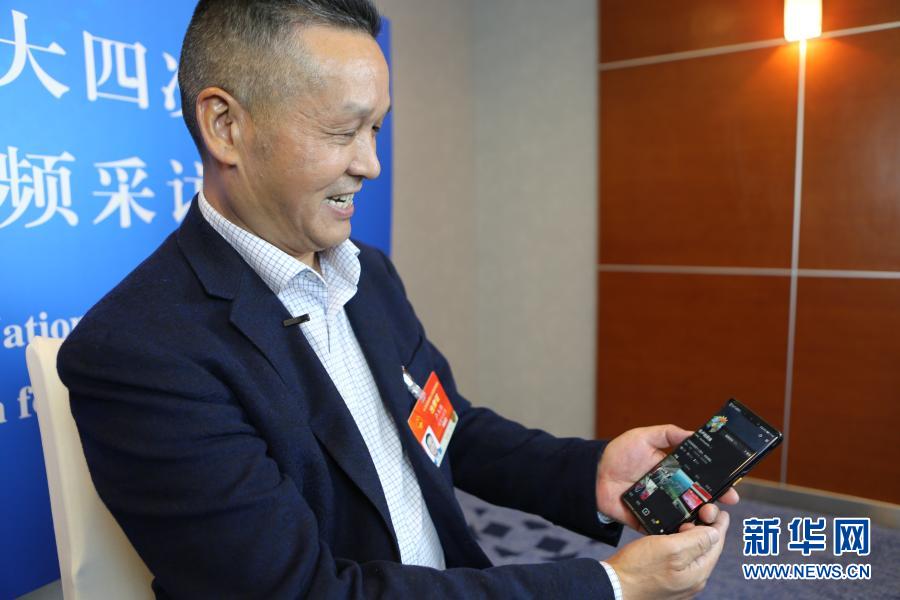 3月3日,全國(guó)人大代表、福建永泰縣希安油茶專(zhuān)業(yè)合作社負(fù)責(zé)人盧玉勝在駐地接受采訪(fǎng)時(shí)展示他為宣傳油茶開(kāi)通的社交媒體賬號(hào)。新華社記者 吳雨 攝