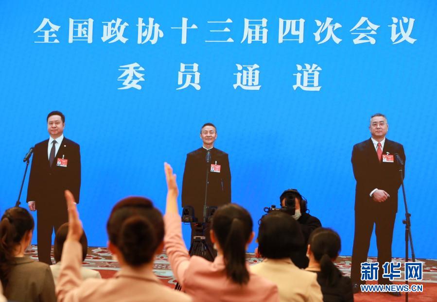 3月10日,全國(guó)政協(xié)十三屆四次會(huì)議在北京人民大會(huì)堂新聞發(fā)布廳舉行第三場(chǎng)“委員通道”采訪(fǎng)活動(dòng)。這是記者(屏幕中手持話(huà)筒者)通過(guò)網(wǎng)絡(luò)視頻方式提問(wèn)。新華社記者 王南 攝
