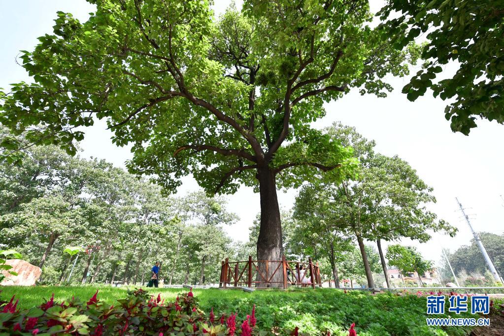 在河南蘭考縣焦裕祿干部學(xué)院門口,游客從“焦桐”下走過(2017年8月9日攝)。新華社記者 馮大鵬 攝