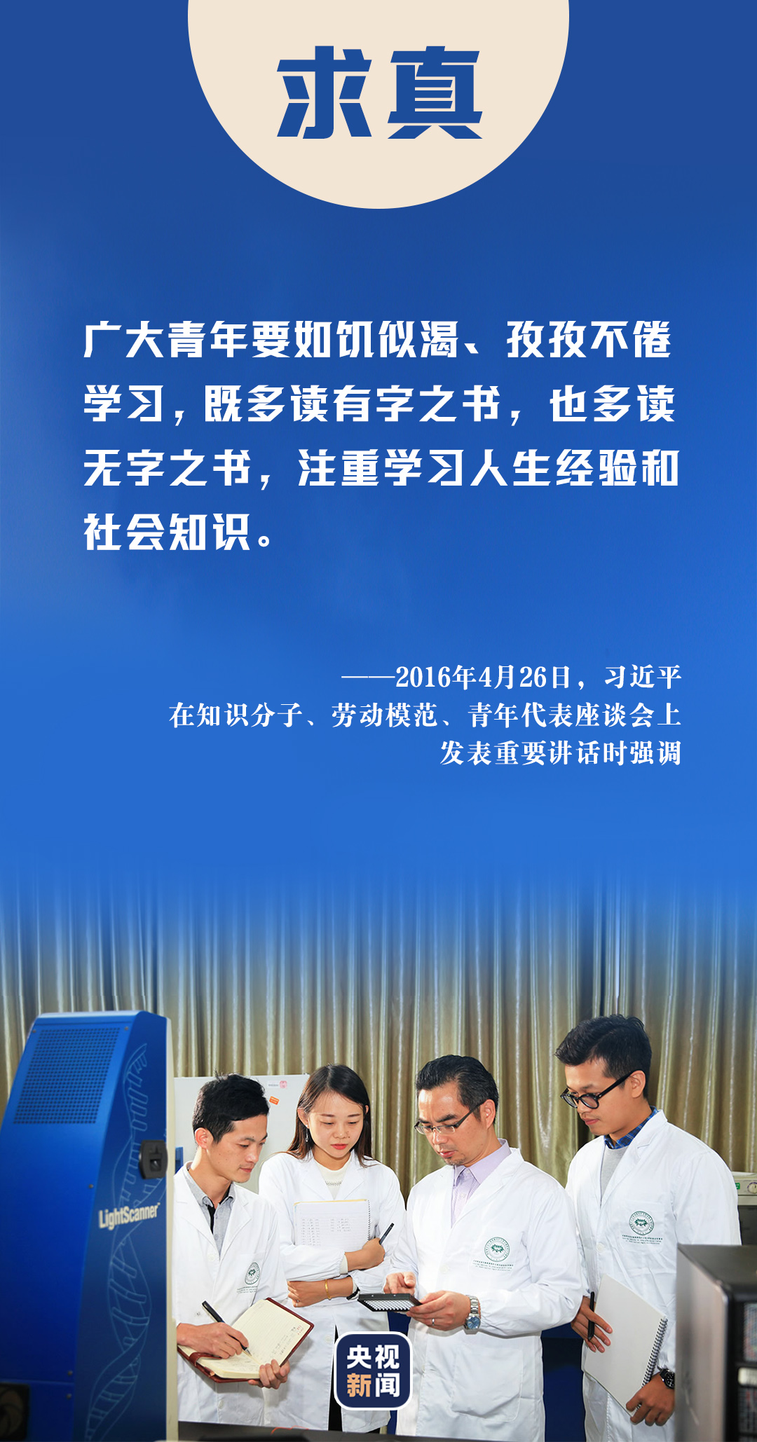 2013年五四青年節(jié),習(xí)近平總書記來到中國(guó)航天科技集團(tuán)公司中國(guó)空間技術(shù)研究院,與青年代表座談??倳浿赋?,廣大青年要堅(jiān)持面向現(xiàn)代化、面向世界、面向未來,增強(qiáng)知識(shí)更新的緊迫感,如饑似渴學(xué)習(xí),既扎實(shí)打牢基礎(chǔ)知識(shí)又及時(shí)更新知識(shí),既刻苦鉆研理論又積極掌握技能,不斷提高與時(shí)代發(fā)展和事業(yè)要求相適應(yīng)的素質(zhì)和能力。