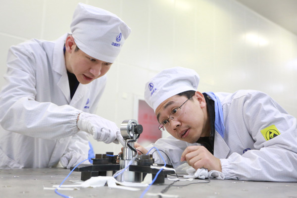 中國(guó)航天科技集團(tuán)公司的青年科研人員在做產(chǎn)品試驗(yàn)。
