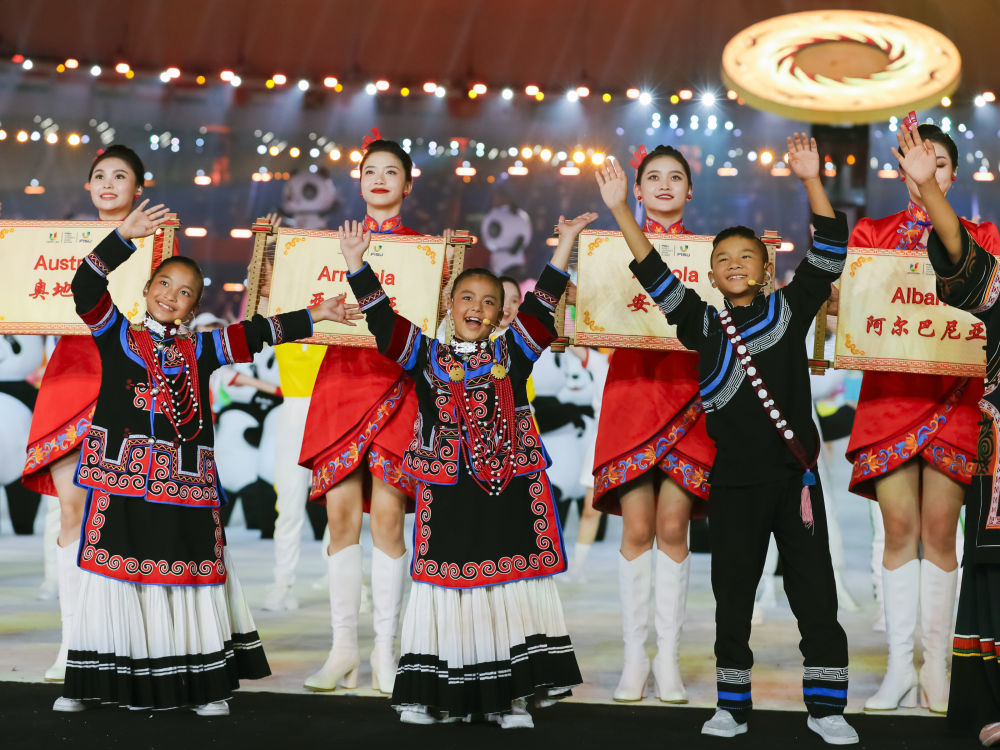 7月28日,來自四川涼山彝族自治州的孩子們在成都大運會開幕式上歌唱。新華社記者 陳澤國 攝