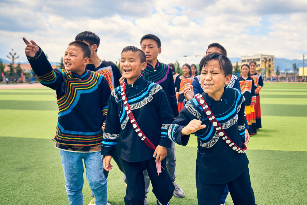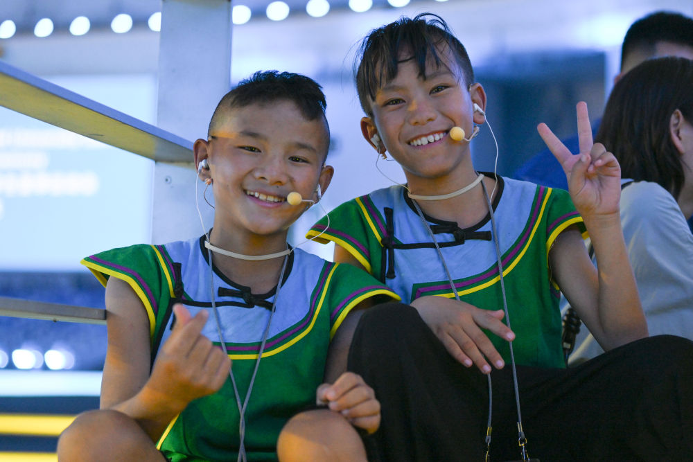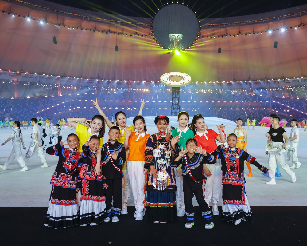 7月23日,成都大運會開幕式彩排結(jié)束后,一些演員主動和來自大涼山的孩子們拍攝合影。新華社記者 沈伯韓 攝