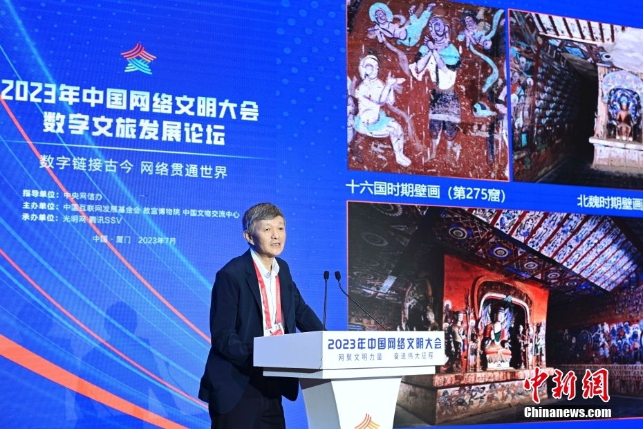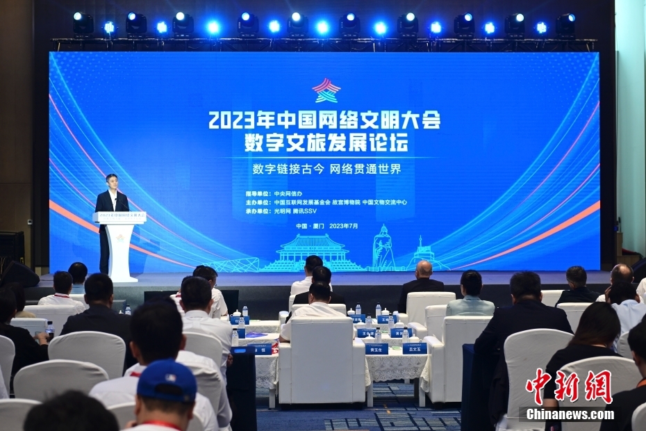7月19日,2023年中國(guó)網(wǎng)絡(luò)文明大會(huì)數(shù)字文旅發(fā)展論壇在福建省廈門(mén)市舉辦。論壇以“數(shù)字鏈接古今 網(wǎng)絡(luò)貫通世界”為主題,邀請(qǐng)國(guó)內(nèi)外數(shù)字化、文博考古、旅游等領(lǐng)域?qū)<液痛砉餐剿鞴偶奈镌跀?shù)字時(shí)代的創(chuàng)造性轉(zhuǎn)化和創(chuàng)新性發(fā)展,以及在數(shù)字技術(shù)賦能下,文旅產(chǎn)業(yè)如何實(shí)現(xiàn)高質(zhì)量發(fā)展。圖為論壇現(xiàn)場(chǎng)。中新社記者 田雨昊 攝