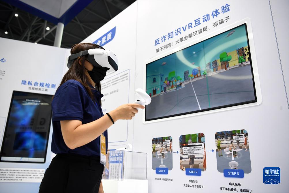 一家參展企業(yè)代表在2022年國家網(wǎng)絡(luò)安全宣傳周網(wǎng)絡(luò)安全博覽會上演示反詐知識VR互動體驗(yàn)項(xiàng)目(2022年9月4日攝)。新華社記者 劉軍喜 攝